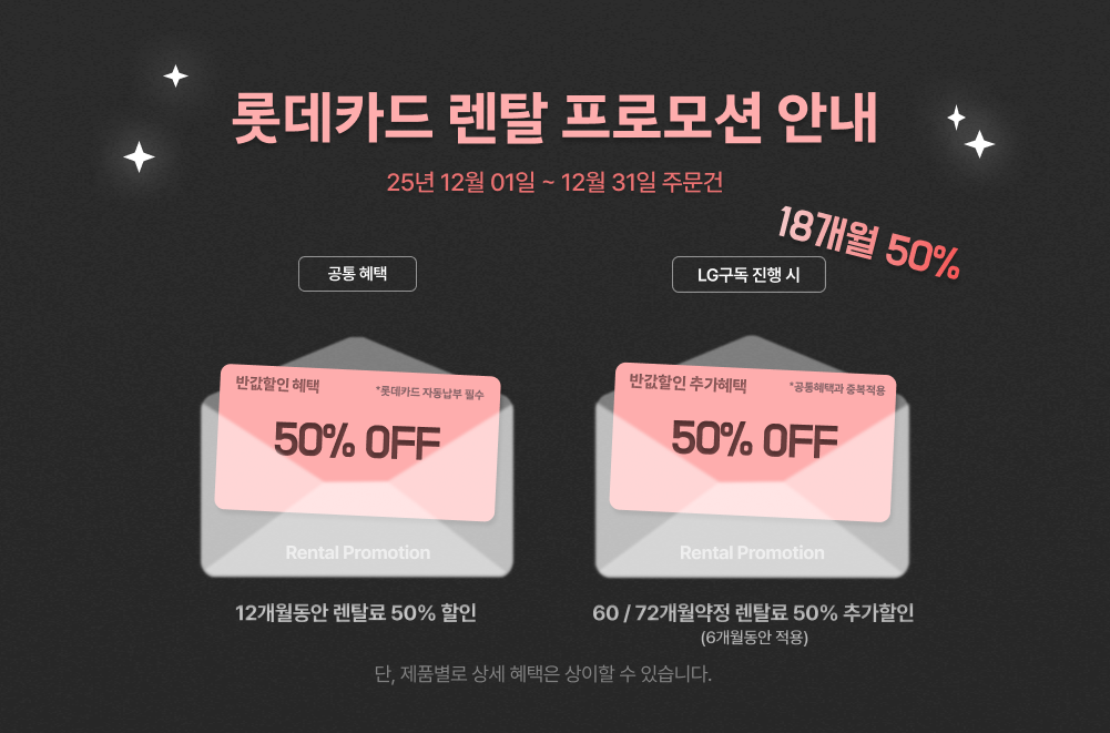 - 월 렌탈료가 할인 금액보다 적을 경우 월 렌탈료까지만 할인이 되며, 자동납부 신청은 각 렌탈사의 고객센터를 통해 신청하여 주시기 바랍니다.
